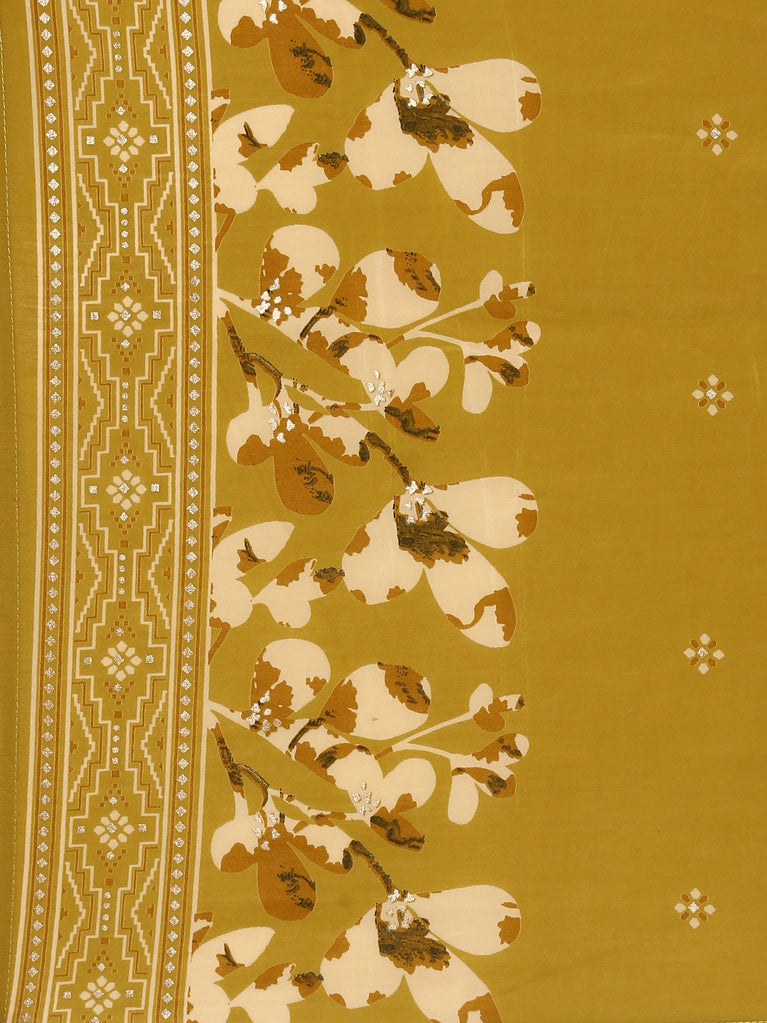 Elevate your ethnic wardrobe with this sophisticated three-piece ensemble crafted from premium dola silk. The vibrant lime green base showcases an intricate floral digital print that combines traditional aesthetics with contemporary design sensibilities. Dola silk's natural lustre and fluid drape create an elegant silhouette, while the digital printing technique ensures crisp, detailed patterns that resist fading.