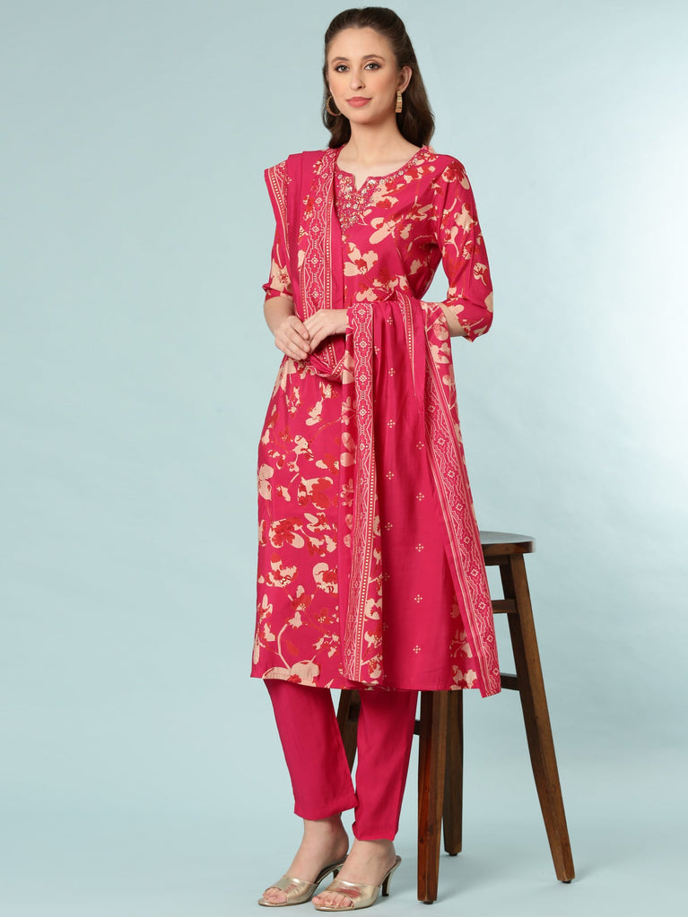 Magenta Dola Silk Digital Print Three Piece Set