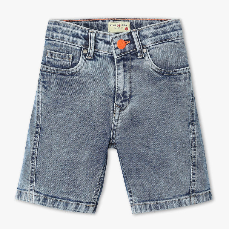 Below Knee Length Stretchable Denim Shorts With Front Cut And Sew