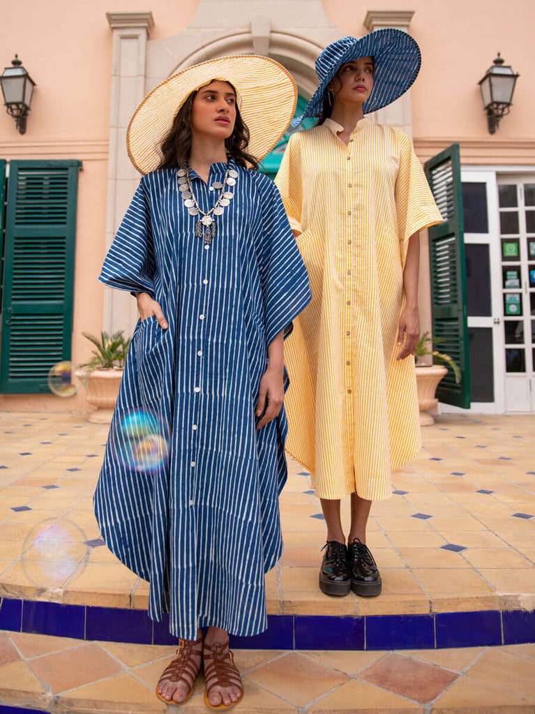 Indigo Stripes Dabu Kaftan Cotton Shirt Dress
