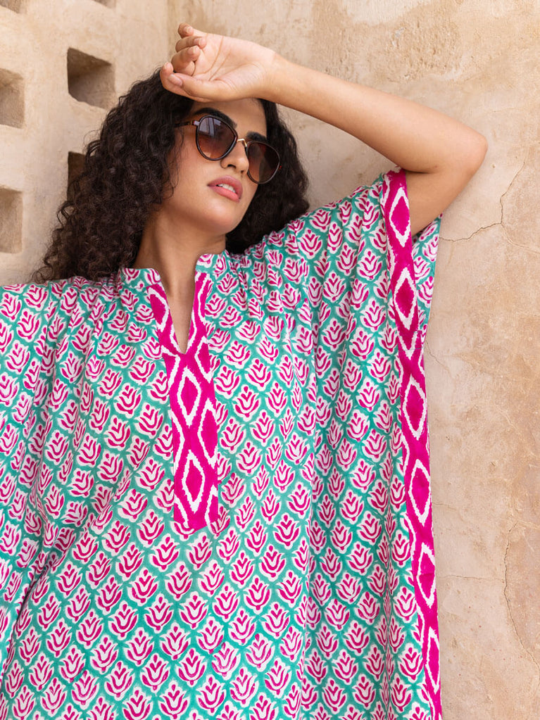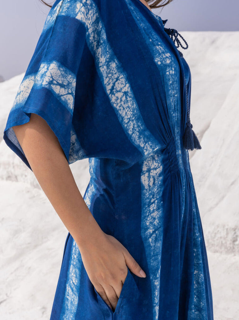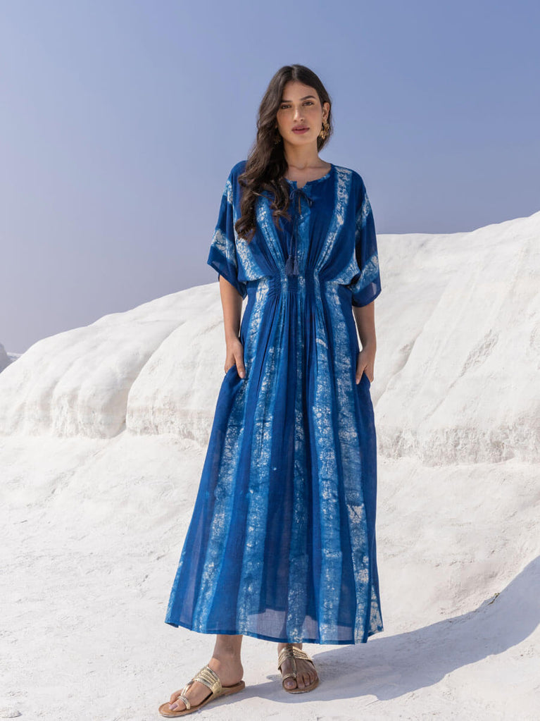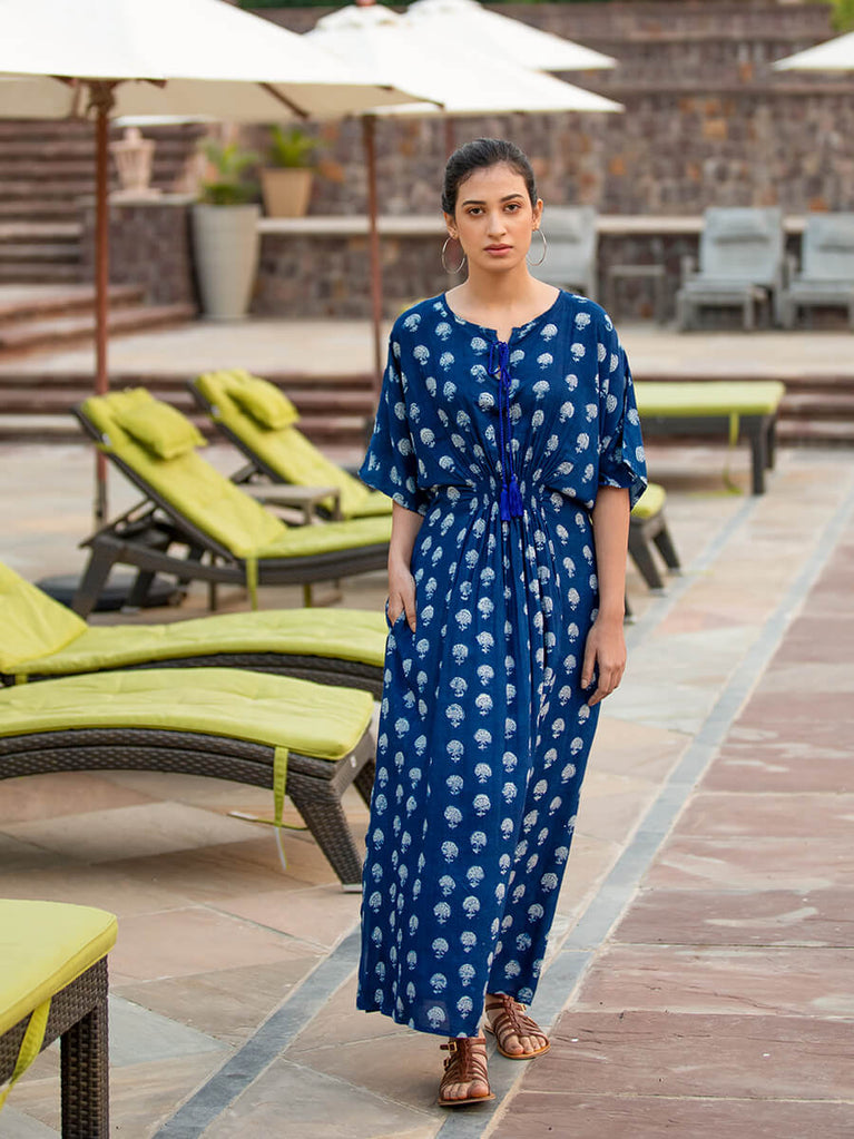 Jheel Indigo Printed Modal Kaftan Maxi Dress