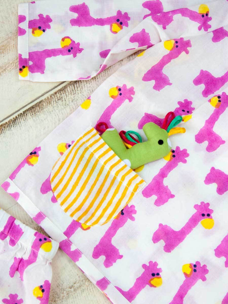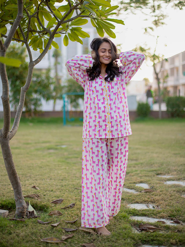 Pink Giraffe Block Printed Cotton Top & Pyjama Set