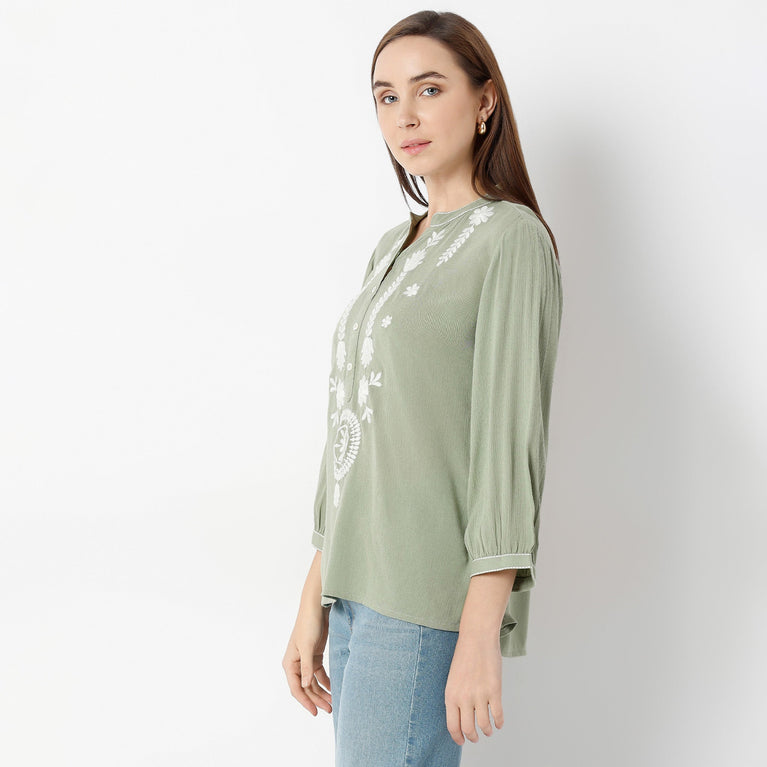 Band Neck Three-Fourth Sleeve Straight Fit Embroidered Tunic