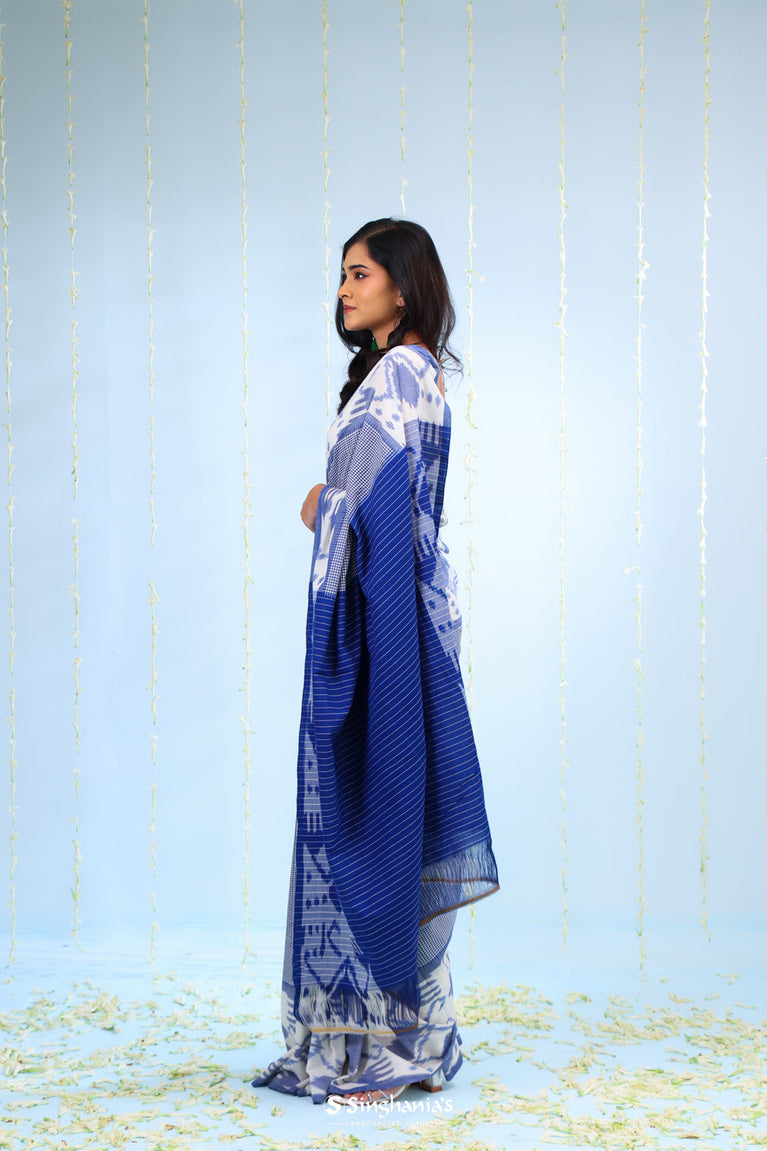A cream base cotton saree decorated with blue colour minute checks pattern weaving all over. The big border and the pallu feature abstract ikkat pattern on solid colour, added with stripes pattern, accentuating the whole look.