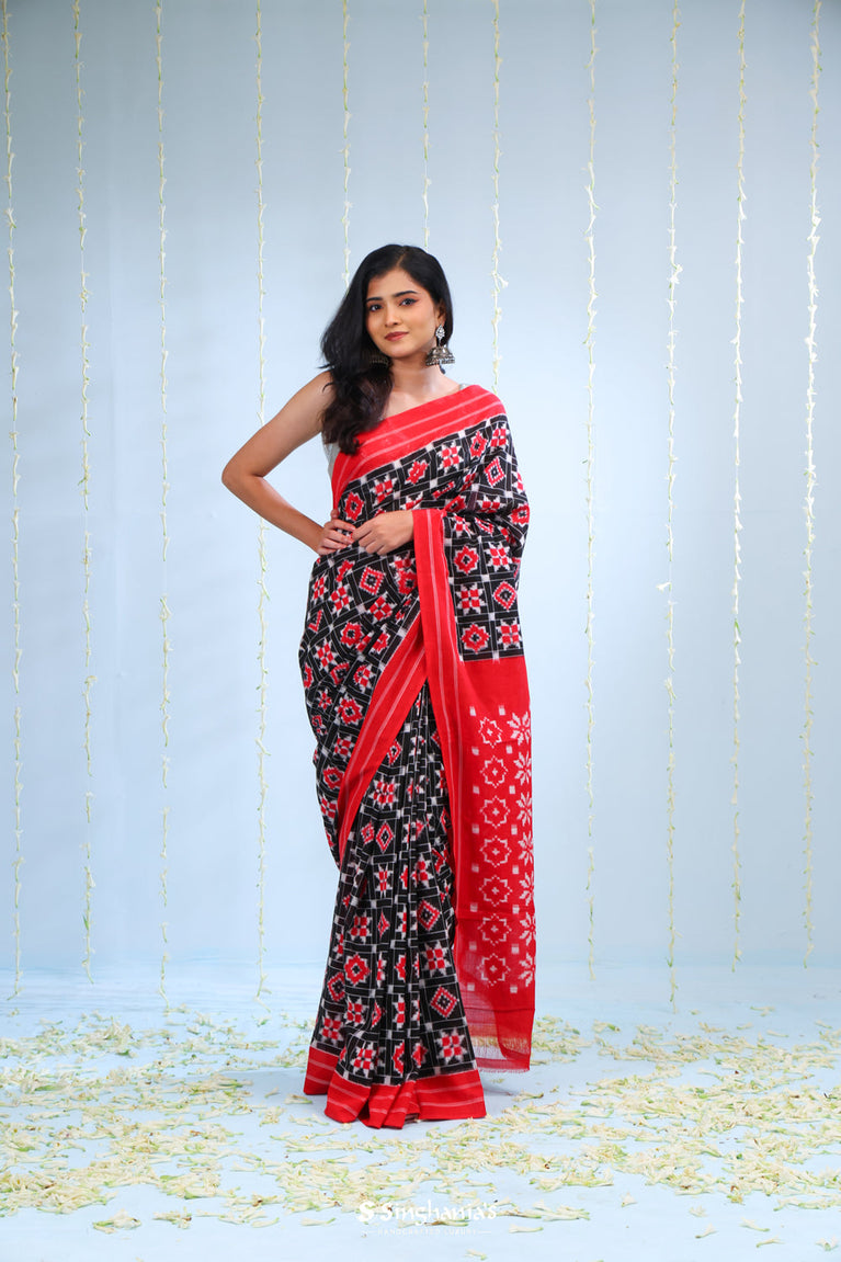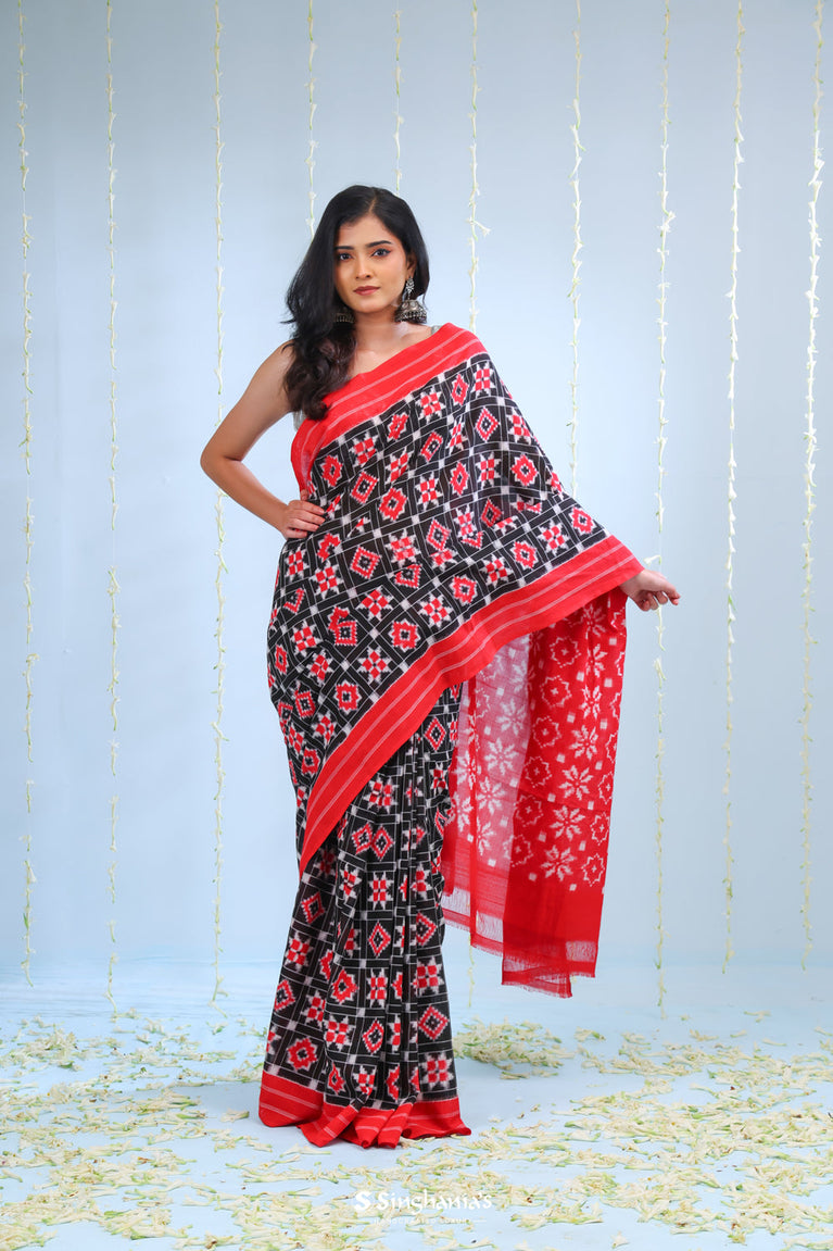 A deep black cotton saree decorated with traditional ikkat pattern weaving all over. The contrast red small border and pallu feature plain solid colour, added with stripes pattern, accentuating the whole look.