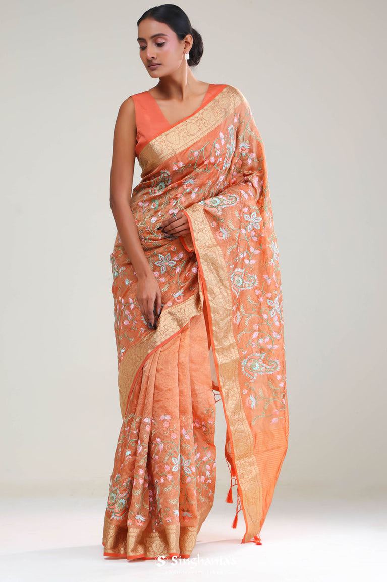Deep Peach Banarasi Tussar Saree With Floral Jaal