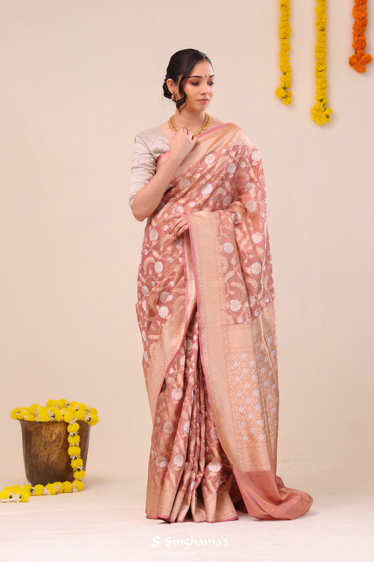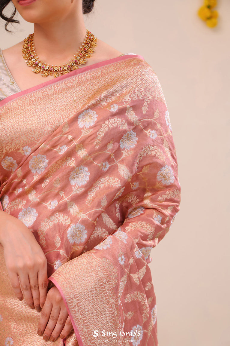 A serene dusty pink banarasi silk saree featuring intricate floral jaal patterns in gold and silver zari weaving. The elaborate border and rich pallu design make it suitable for wedding functions and festival wear.