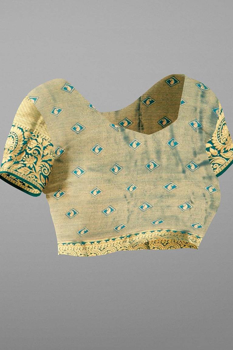 A beautiful dolphins aqua kanjivaram silk saree showcasing multi-floral jaal in gold zari all over the body. The big border & pallu features traditional arrangement of floral, peacock and kaddi patterns. A perfect choice for wedding receptions and festive occasions.