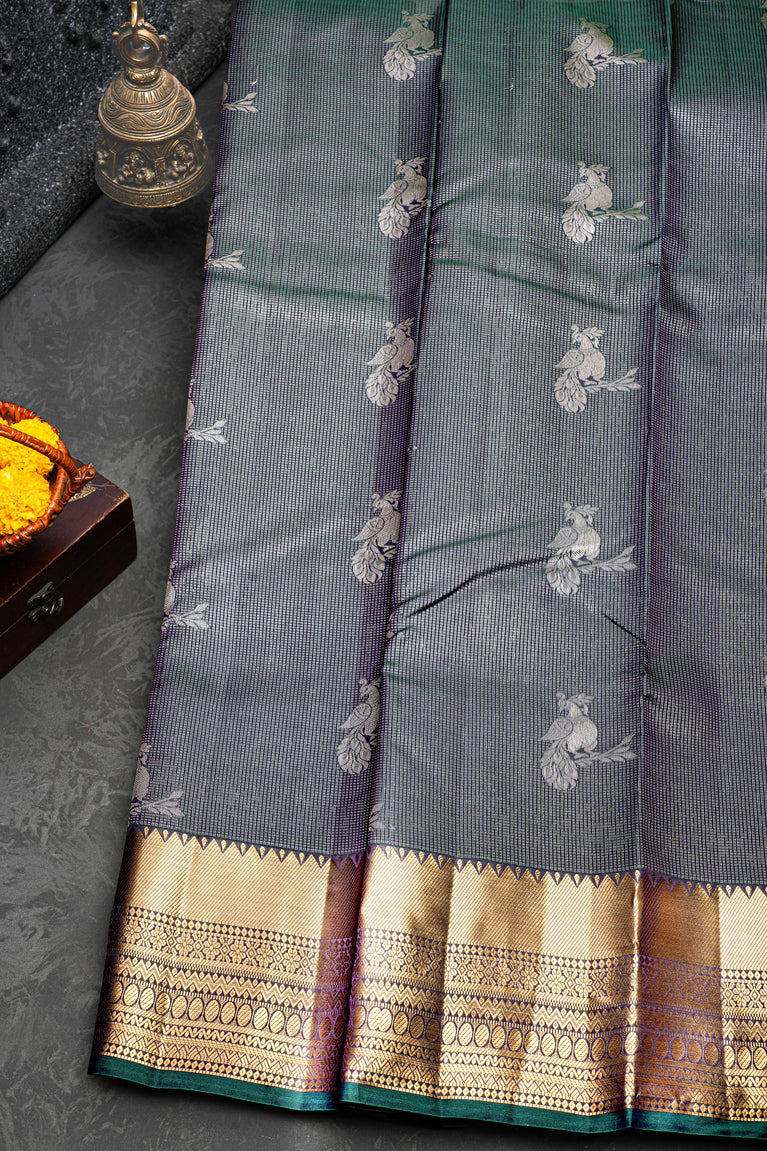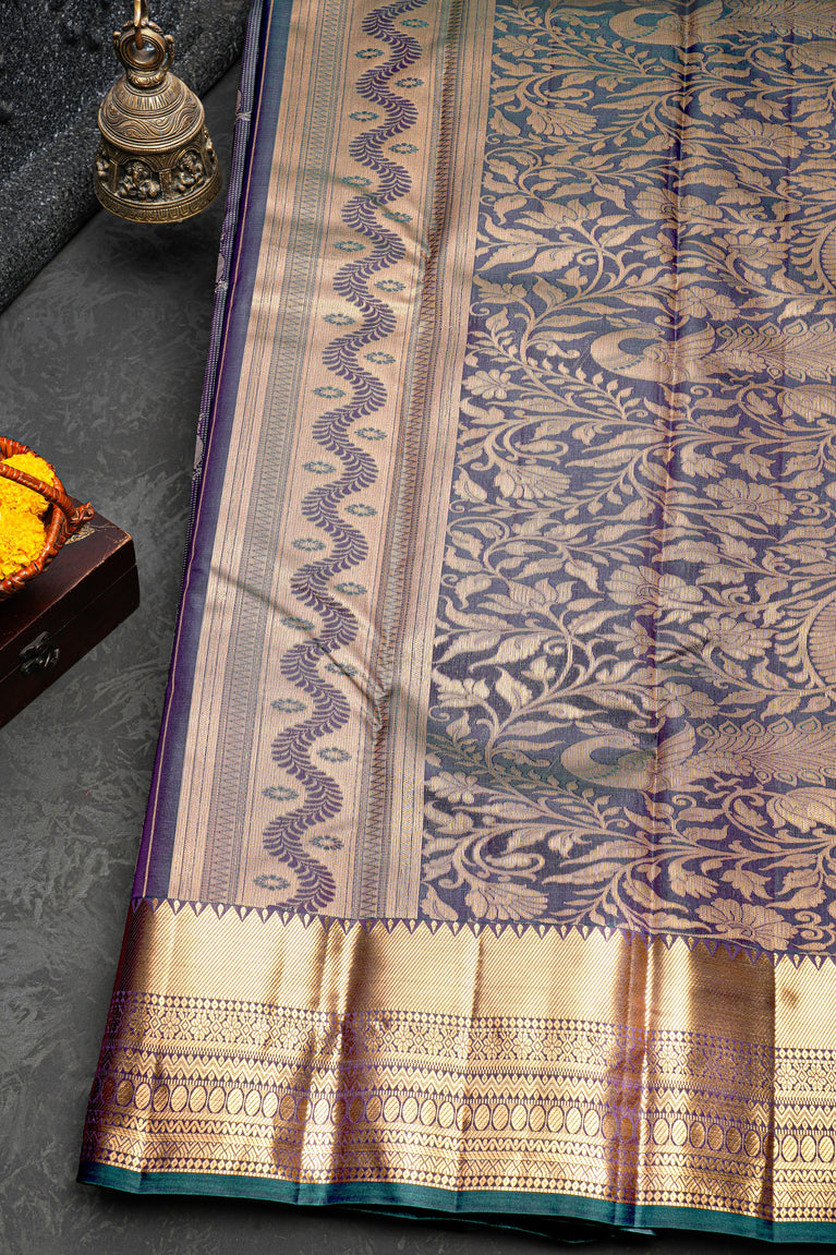 An electric blue kanjivaram silk saree where the body features delicate peacock motif in gold zari, complemented by a rich pallu displaying classical floral motifs. The contrasting silver border features floral and fauna motifs. Perfect choice for special occasions.