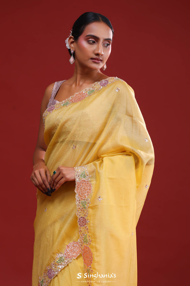 Gold Tissue Saree With Hand Embroidery And Floral Sequins Work
