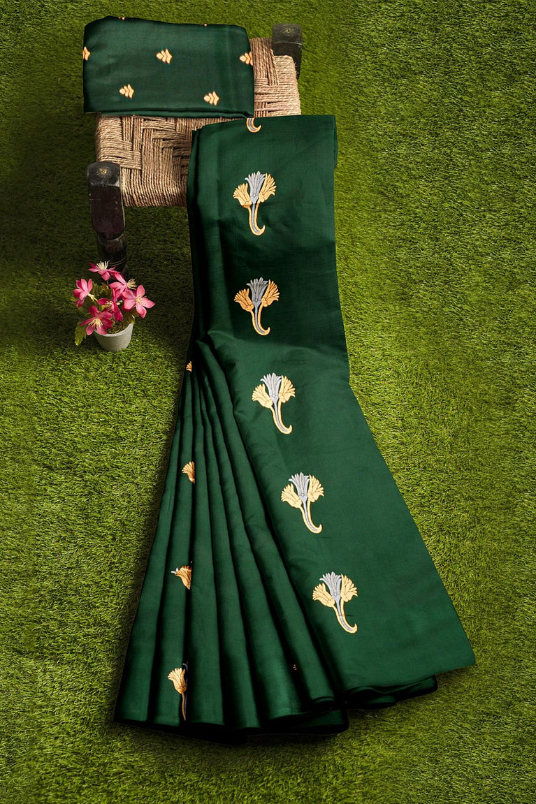 This exquisite green and gold Jimmy tissue saree features delicate hand embroidery that enhances its traditional elegance. Crafted from fine tissue fabric, it offers a lightweight and graceful drape, perfect for festive occasions and formal events. Included is a ready-made blouse tailored to complement the saree, ensuring a complete and sophisticated look with minimal effort. Elevate your ethnic wardrobe with this beautifully embroidered saree that combines comfort and artisanal craftsmanship.