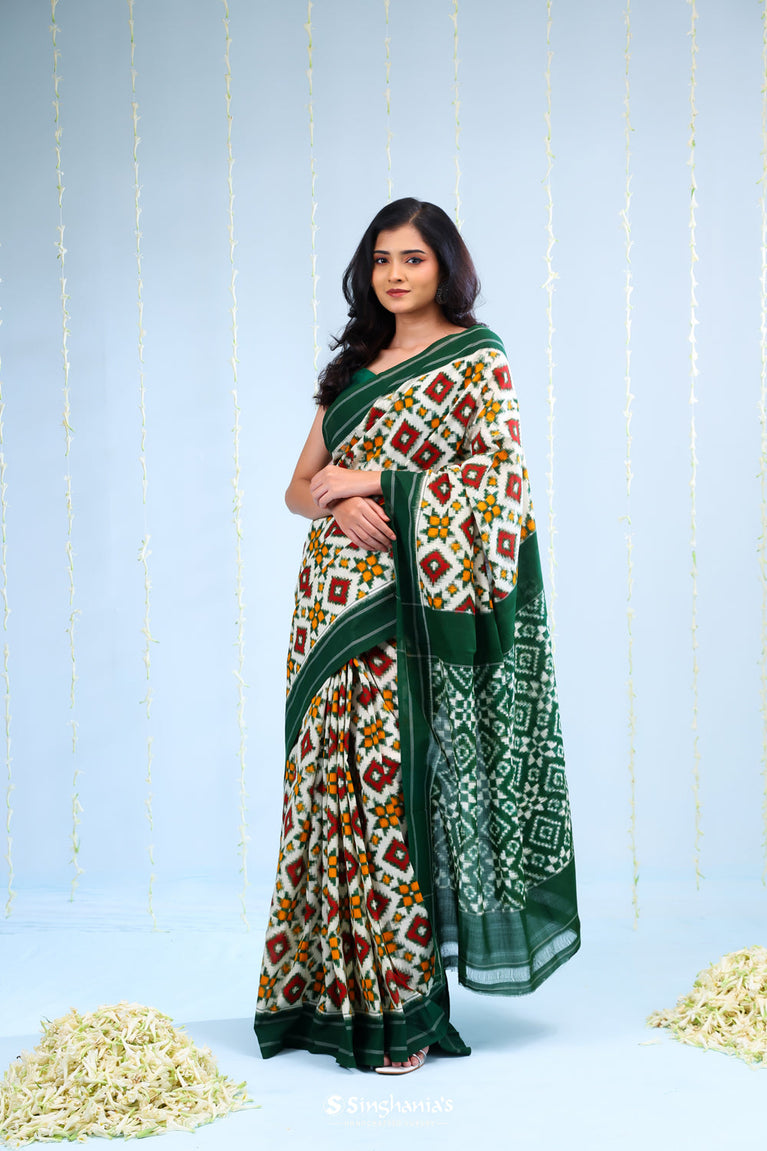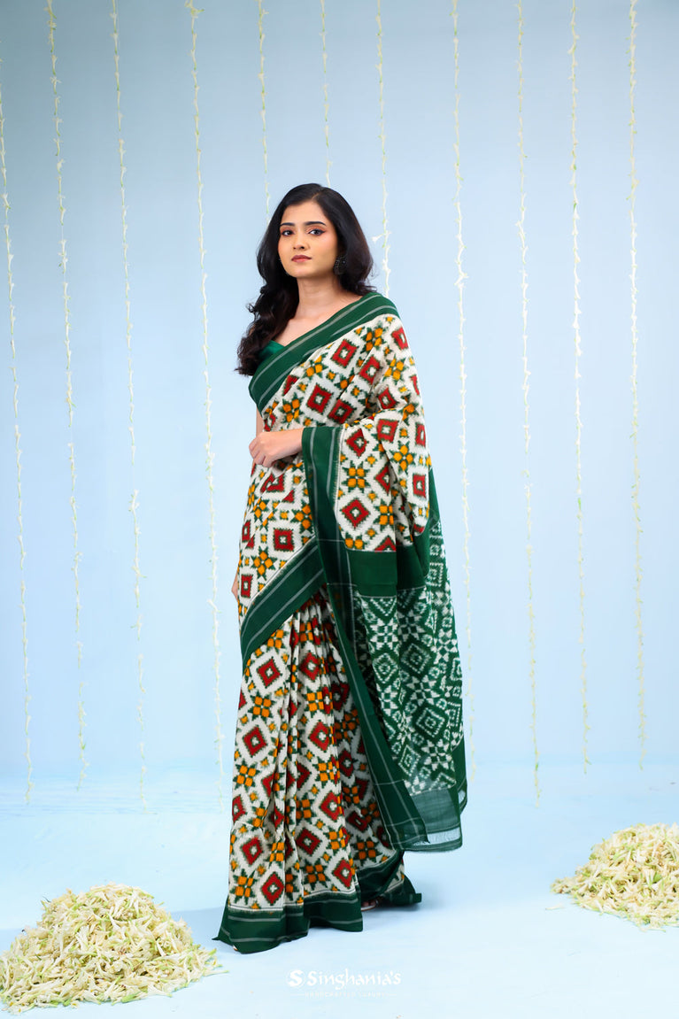 A white base cotton saree decorated with red-yellow-green floral ikkat pattern weaving all over. The border and the pallu feature stripes pattern on solid green colour, added with abstract pattern, accentuating the whole look.