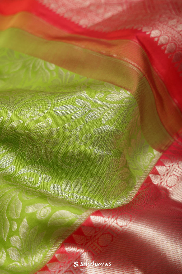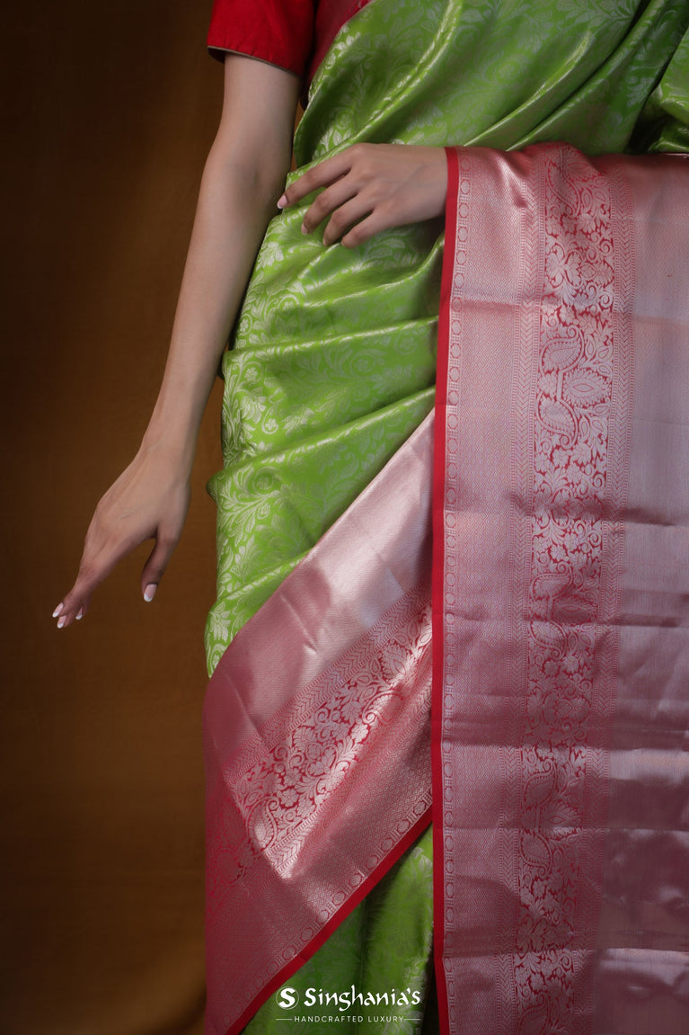 Exquisitely handwoven, this Kelly Green Kanjivaram Silk Saree features an ornate silver zari floral jaal design and contrasting red border designed with with floral and kaddi pattern. An elegant saree for festivities and weddings.