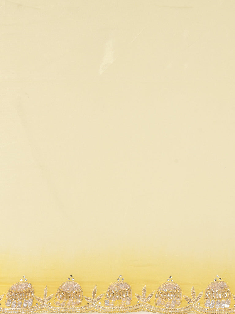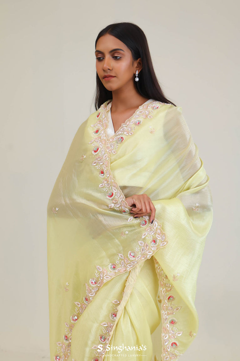 A luminous lemon yellow saree with a tissue base, which features floral buttis on the body. Accentuated with a small floral embroidery and scallop edged border made with sequins & glass beads, that adds to the whole look. Suitable for festive wear and wedding parties.