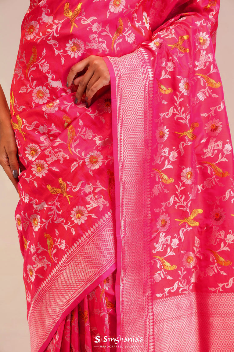 This is a silk banarasi punch pink saree for festive, wedding occasions and party wear. Adorned with gold and tilfi zari floral-jungle motif jaal weaving all over the body and a small, diamond butti border and pallu, completing the whole look.