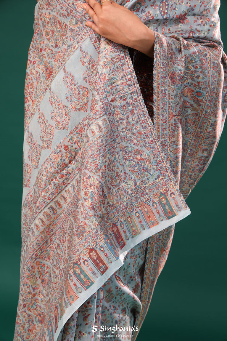 This soothing saree is crafted from moonga silk and features the intricate and colourful floral jaal kani weave from Kashmir. The serene marian blue colour is perfect for special occasions. The saree comes with a matching blouse piece.