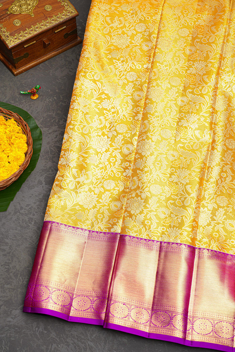 LEMON YELLOW and PURPLE FLORAL JAAL SILK Saree with KANCHIPURAM