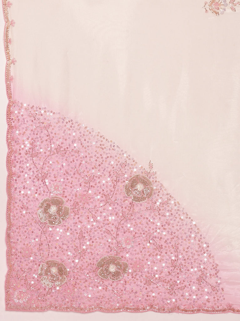This baby pink net saree is expertly crafted with delicate cut Dana hand embroidery, showcasing refined artistry and timeless elegance. The soft net fabric ensures a graceful and comfortable drape, making it an ideal choice for formal events and celebrations. The intricate embroidery enhances the saree’s texture and visual appeal, reflecting skilled craftsmanship suited for connoisseurs of fine ethnic wear.