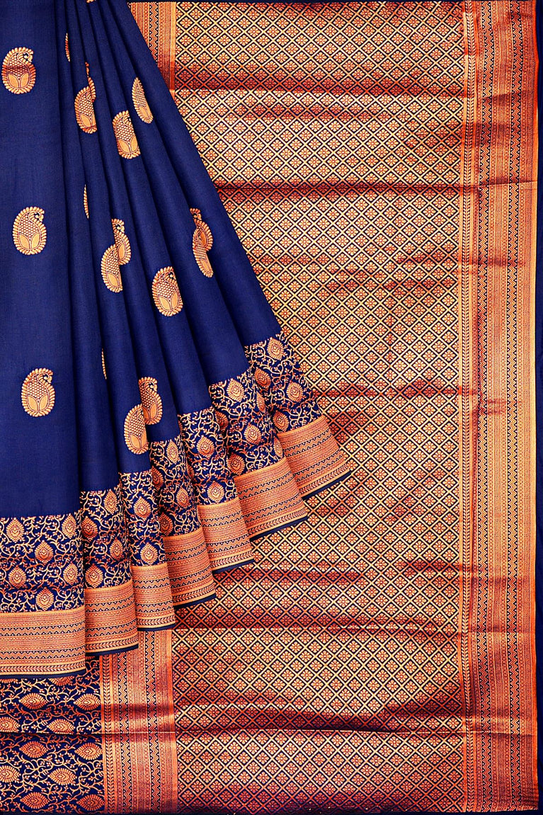 NAVY BLUE and GOLD FLORALS SILK BLEND Saree with SEMI PATTU