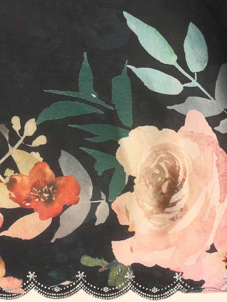 Elevate your elegance with this black stain floral printed saree, featuring intricate Swarovski embroidery that catches the light with every movement. The delicate floral design combined with sparkling details offers a refined and graceful look, perfect for special occasions. Crafted to enhance your sophistication, this saree blends traditional charm with modern glamour seamlessly.