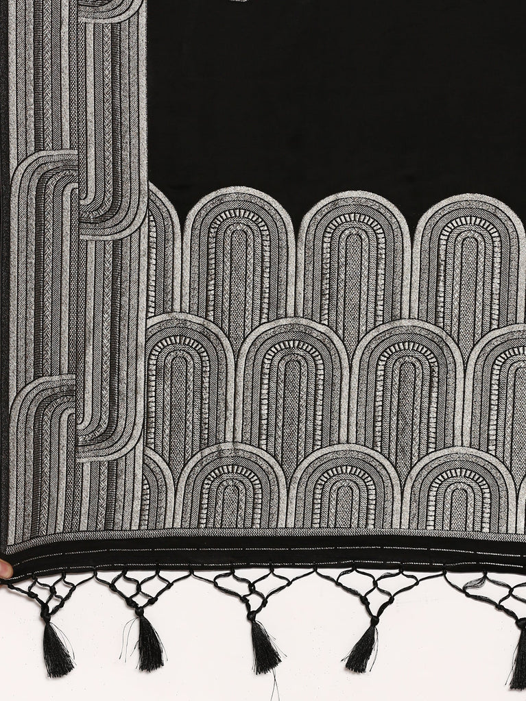 Elevate your ethnic wardrobe with this stunning black crepe saree, beautifully adorned with intricate embroidery work. The luxurious crepe fabric drapes gracefully, offering comfort and sophistication for any occasion. Paired with a readymade blouse, this saree is designed for effortless elegance—no stitching required. Perfect for festivals, celebrations, or special events, it combines traditional craftsmanship with modern convenience. The rich black hue complements all skin tones, while the detailed embroidery adds a touch of refined glamour. Embrace timeless style with this versatile piece that celebrates Indian heritage.