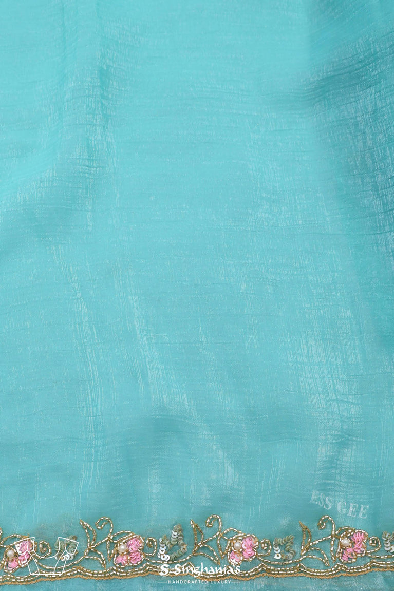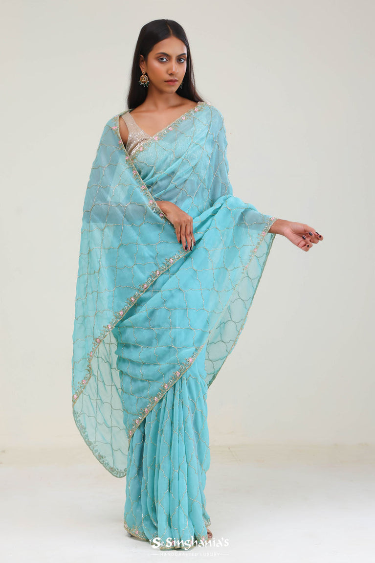 A beautiful bright blue saree with a silk base, which features arch jaal embroidered pattern. Added with intricately embroidered border and pallu, crafted with stones and glass beads. It’s an excellent choice for festivals, receptions and grand celebrations.