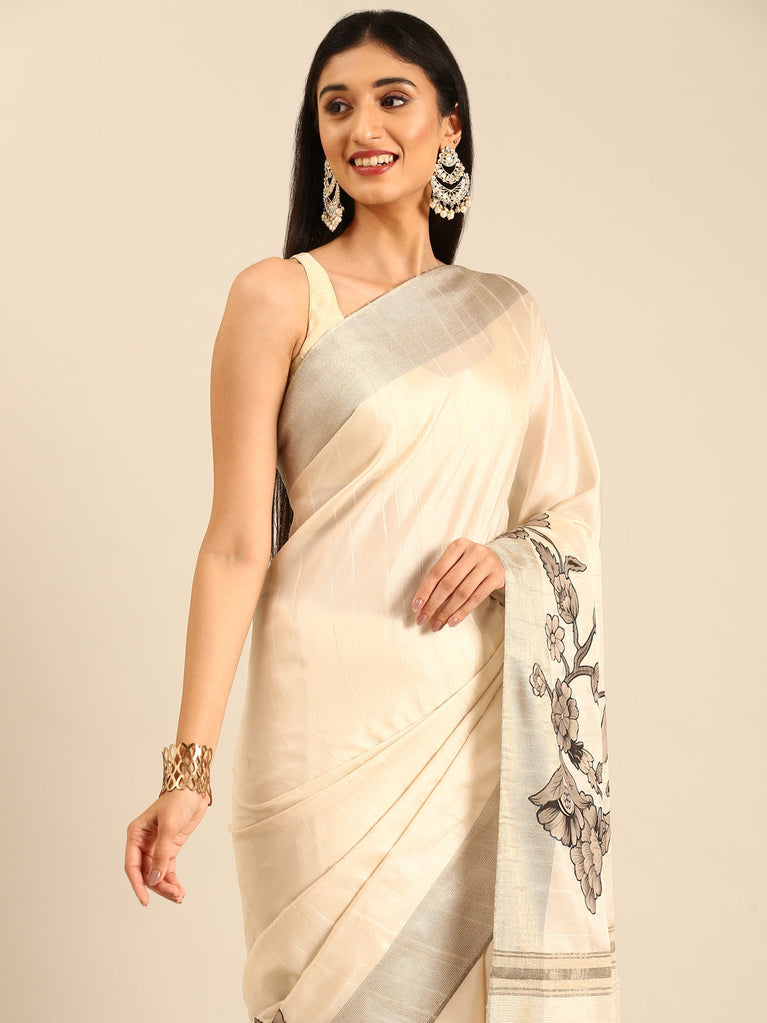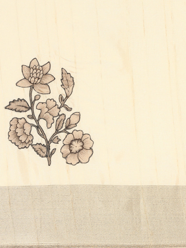 Cream Chanderi Silk Saree With Sequins And French Knot Embroidery
