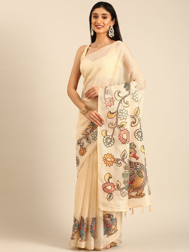 Experience elegance with this cream kota saree featuring intricate kalamkari appliqué work on the pallu. Its lightweight, breathable fabric ensures comfort throughout the day, while the detailed artistry adds a touch of traditional charm. Perfect for festive occasions or casual gatherings, this saree beautifully combines style and comfort to enhance your graceful presence.