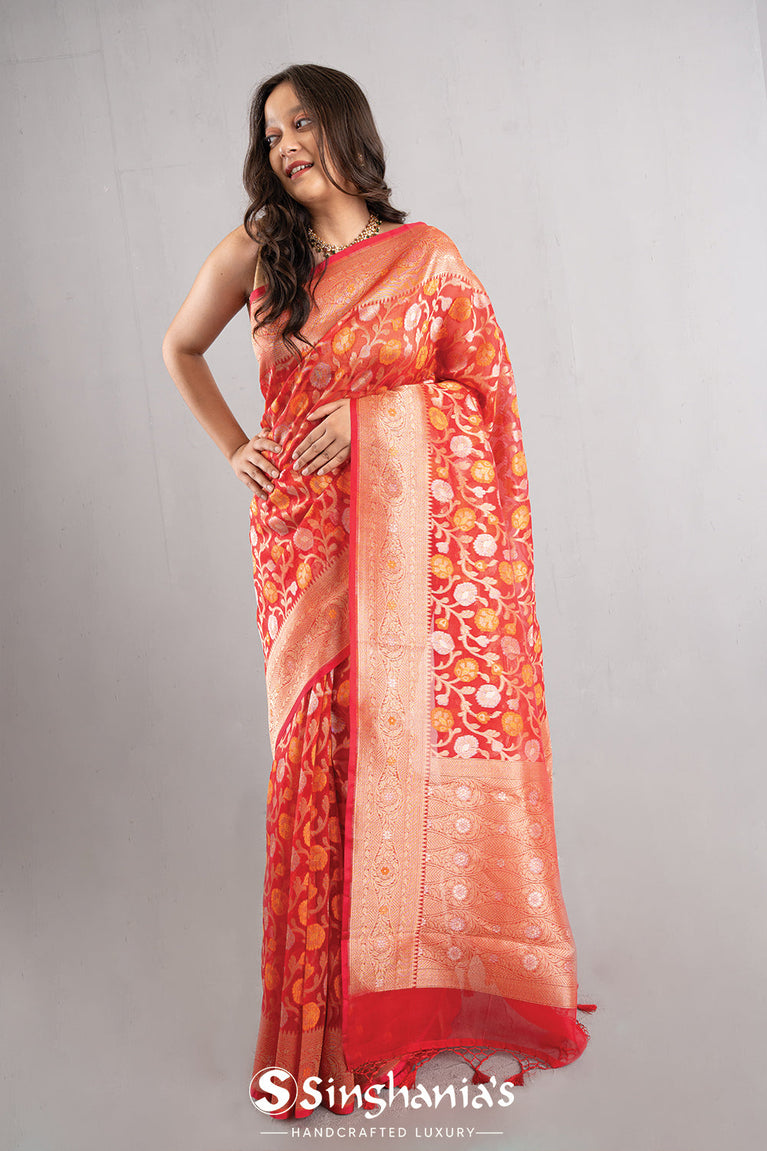 This coral pink organza banarasi saree, graced with floral jaal weaving in gold and tilfi zari across the body, is a delightful choice for festivals, weddings and parties. The geometric border and pallu elegantly completes the overall design, enhancing its charm.