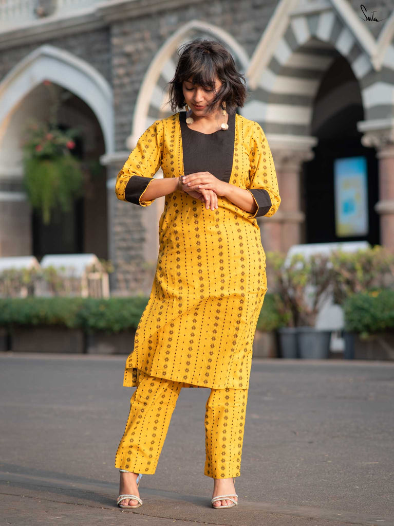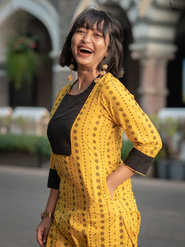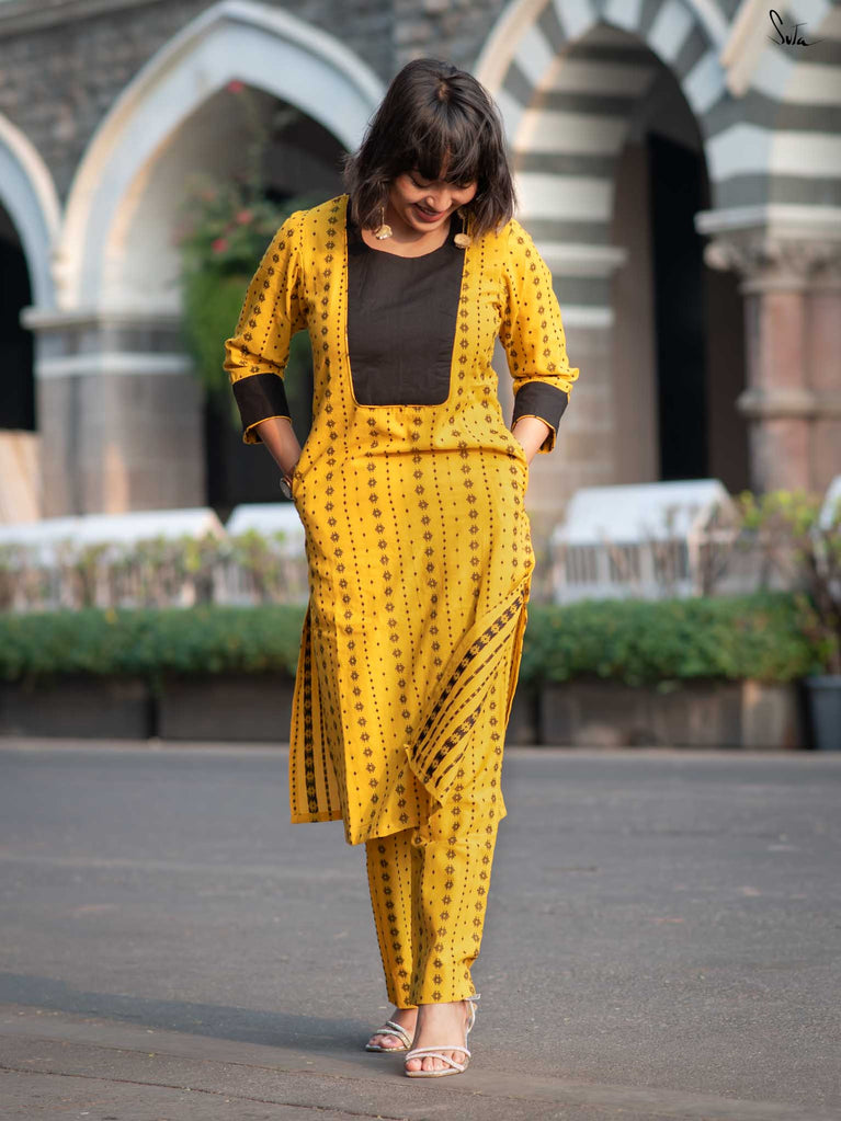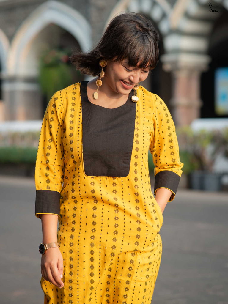 Say hello to sunshine with the Alvin Black Kurta Set. This cheerful yellow cotton ensemble features a striking black floral yoke and matching cuff accents. The soft fabric ensures all-day comfort, while the pocket keeps it casual and convenient. A perfect mix of bold and breezy.