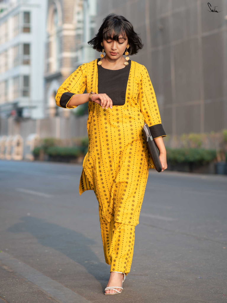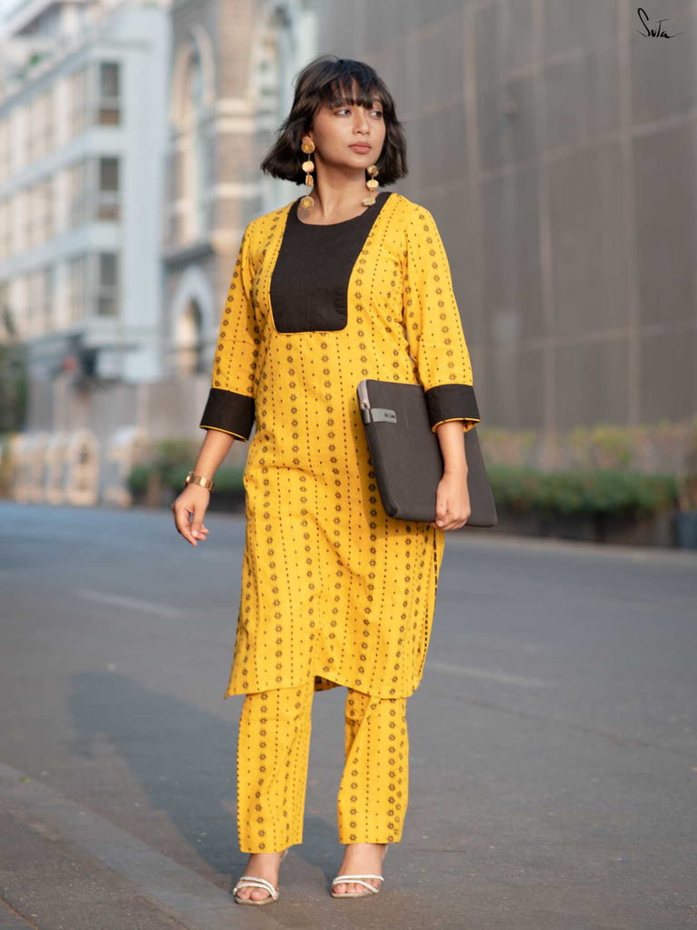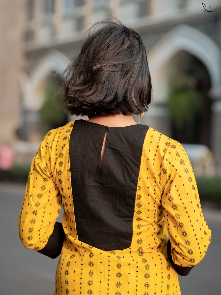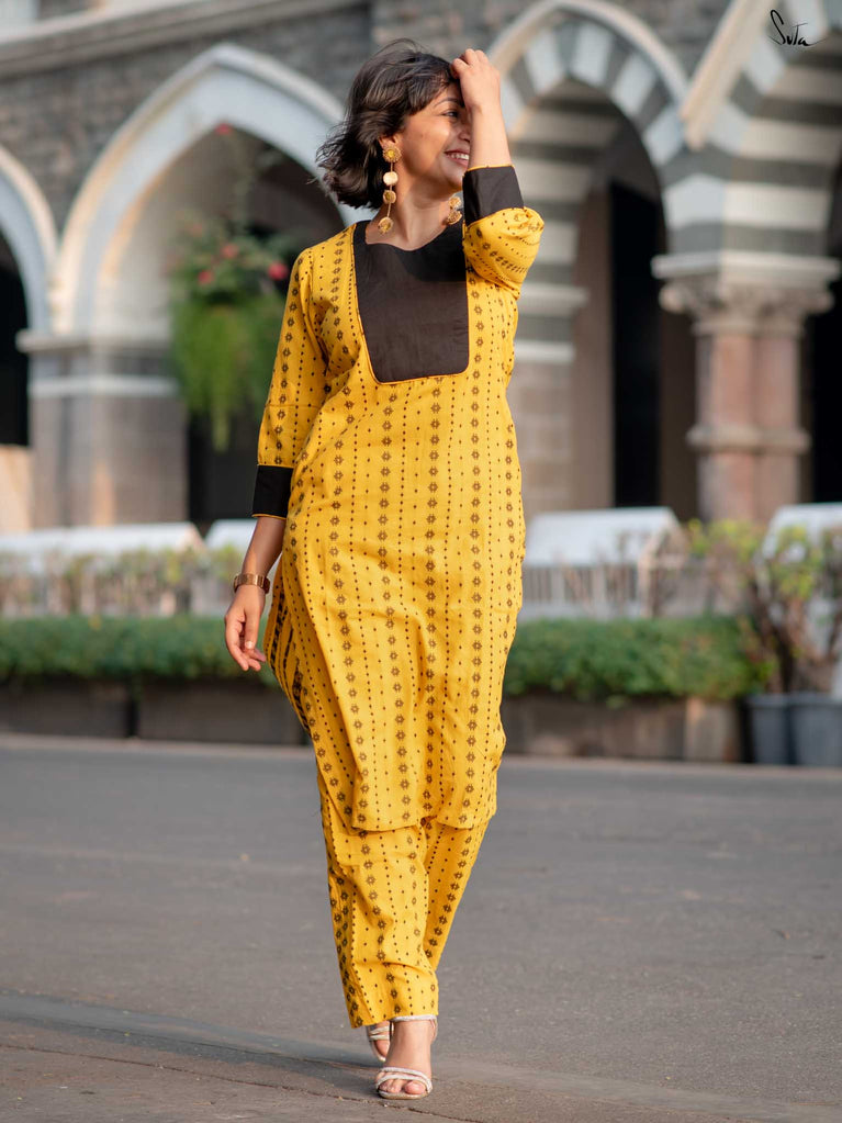 Say hello to sunshine with the Alvin Black Kurta Set. This cheerful yellow cotton ensemble features a striking black floral yoke and matching cuff accents. The soft fabric ensures all-day comfort, while the pocket keeps it casual and convenient. A perfect mix of bold and breezy.
