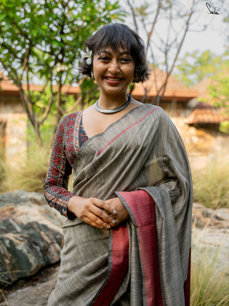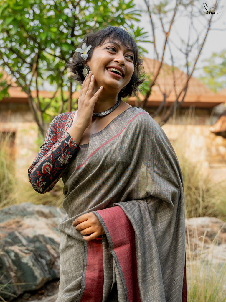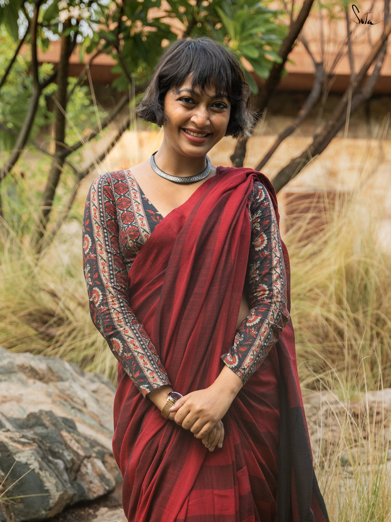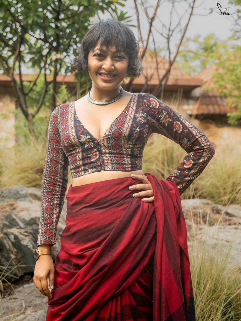 A blouse that exudes elegance and mystique, Bronzed Shadow features a flattering full-sleeve design with a chic V-neckline and front hook opening for a perfect fit. Made from soft cotton, this non-padded blouse is adorned with maroon, black, and grey floral prints. Pair it with any saree for a sophisticated and elevated look perfect for both casual and festive occasions.