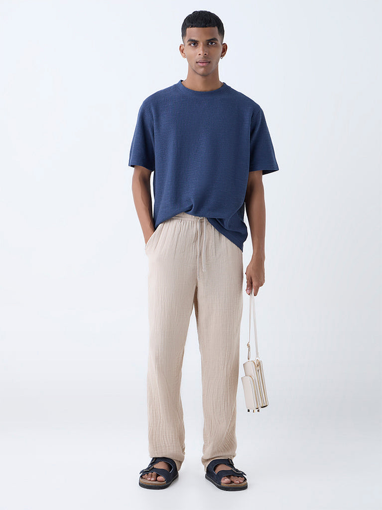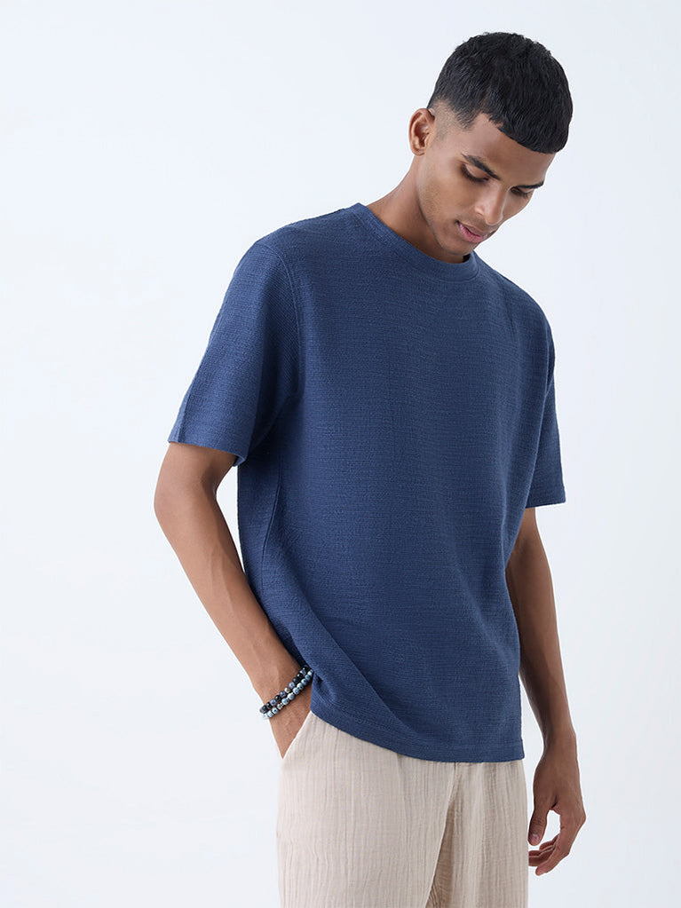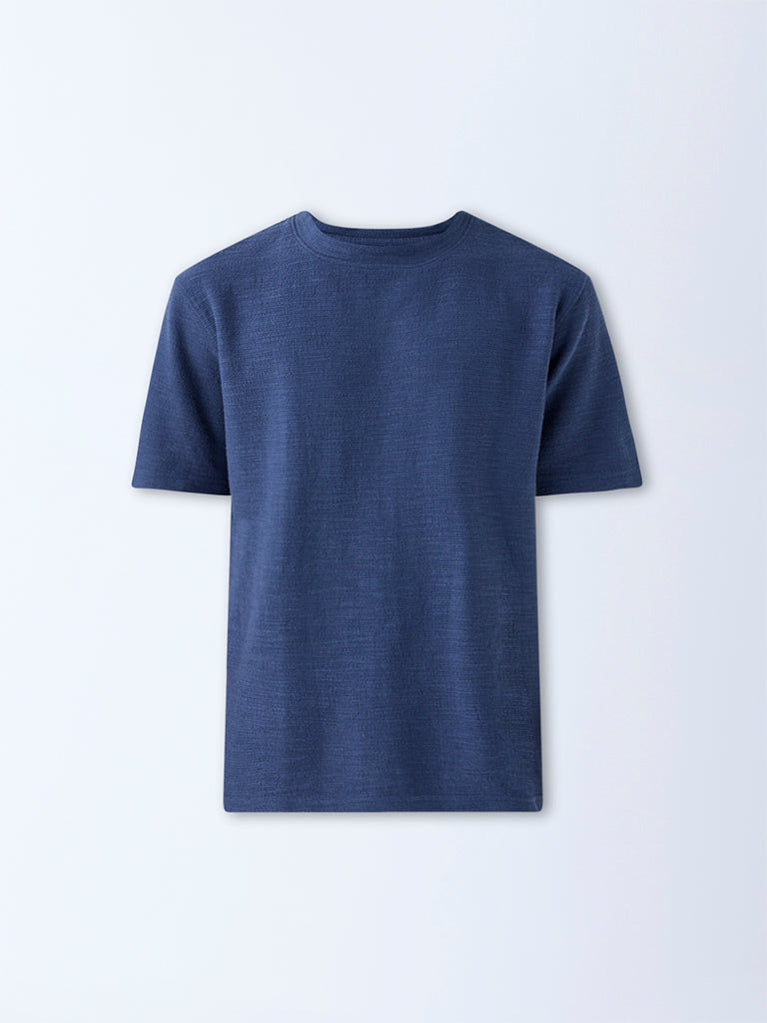 This indigo t-shirt from ETA delivers everyday ease with its soft cotton-blend construction and self-textured finish. Designed with a round neck and short sleeves, it’s a versatile staple that pairs effortlessly with everything from chinos to denim.