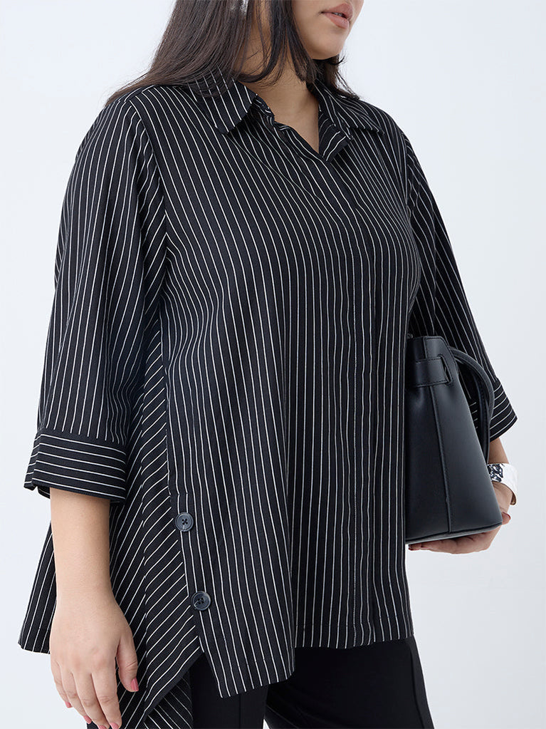 Timeless style meets everyday ease in this black striped blouse from Gia. Tailored from a sumptuous linen-blend fabric, it’s detailed with a classic collar, three-quarter sleeves, and a concealed placket for a polished finish.