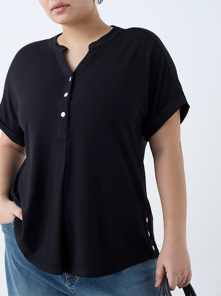 This black blouse from Gia leans into quiet sophistication with its minimal silhouette and luxurious hand feel. Crafted from a sumptuous fabric, it’s detailed with a collar and a gold-toned button placket that adds just the right touch of shine. Finished with full sleeves, it’s the kind of piece that speaks volumes without raising its voice.