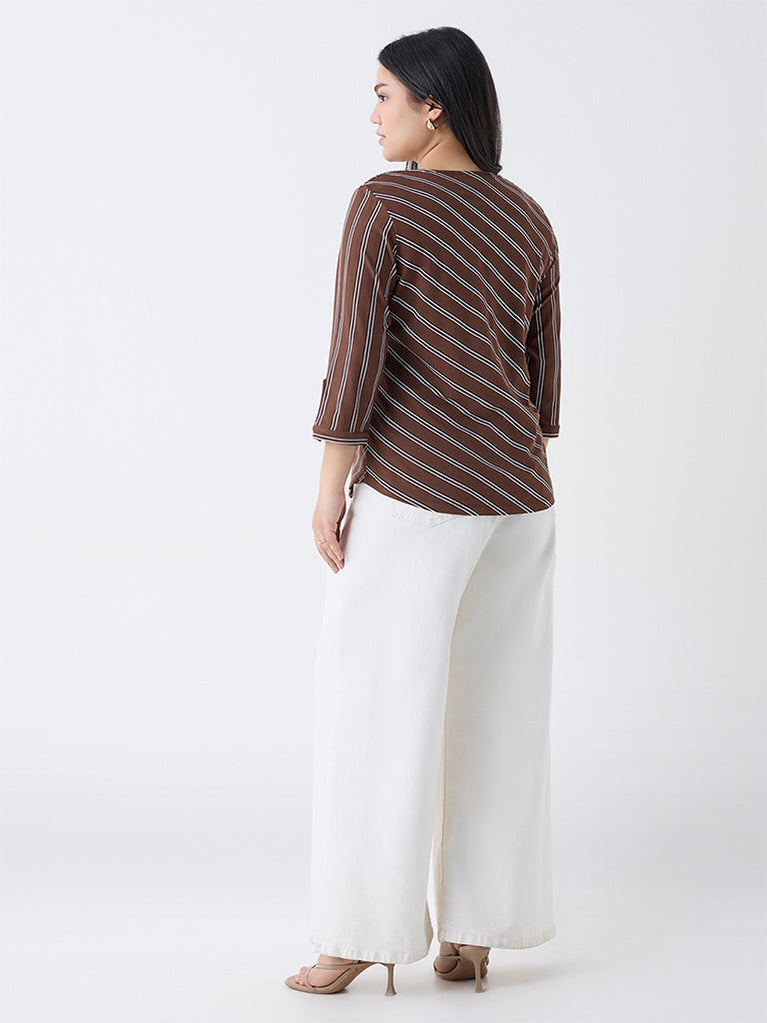 Gia updates everyday essentials with this dark brown top, accented with elongating vertical stripes for a flattering finish. Milled from a lightweight fabric, it features a round neckline and three-quarter sleeves that balance comfort with a casual charm.