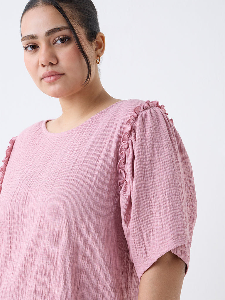 Perfect for soft, fuss-free dressing, this dusty pink top by Gia is crafted from a breezy crinkle-textured fabric that flatters without clinging. The round neck keeps it classic, while ruffle-detailed short sleeves add a playful, feminine touch.