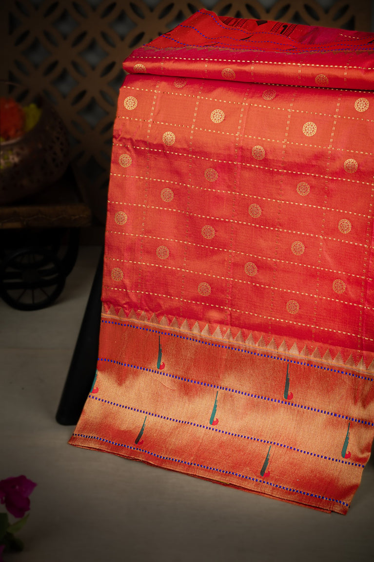 Varamahalakshmi Peach Pink & Gold and Red Paithani Checks And Buttis Saree