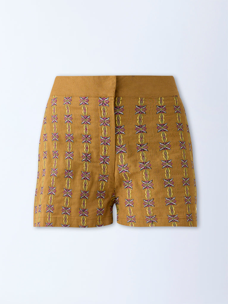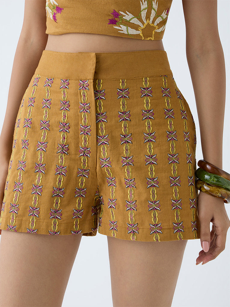Bombay Paisley Mustard Embroidered Cotton-Blend Shorts