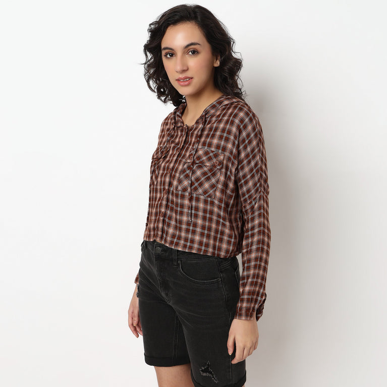 Checkered Lapel Collar Full Sleeve Crop T-Shirt