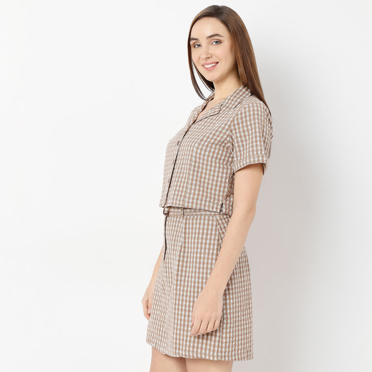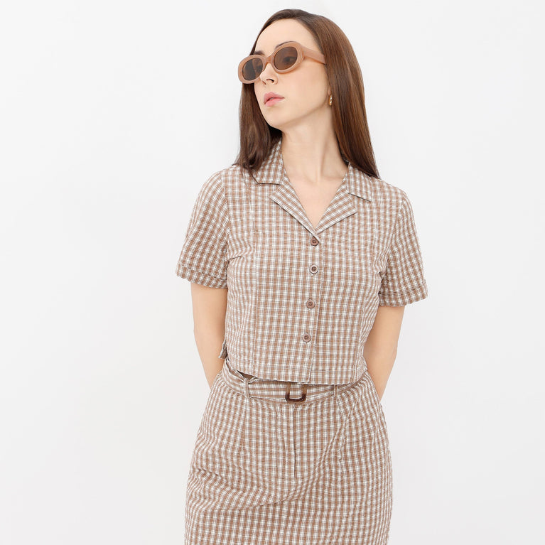 This checkered pattern crop top has a collar and short sleeve. Made from cotton, it is soft and comfortable to wear.