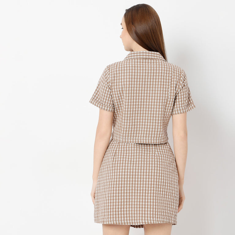 Checkered Lapel Collar Short Sleeve Crop Shirt