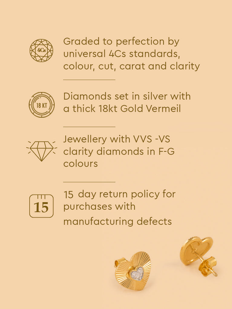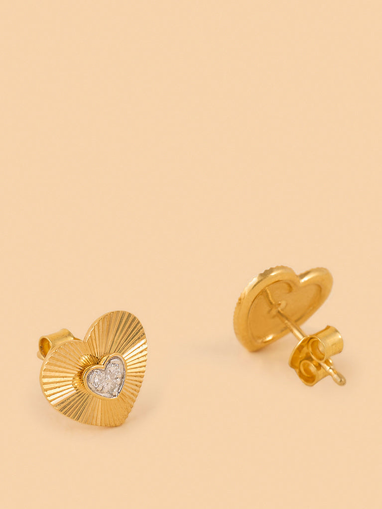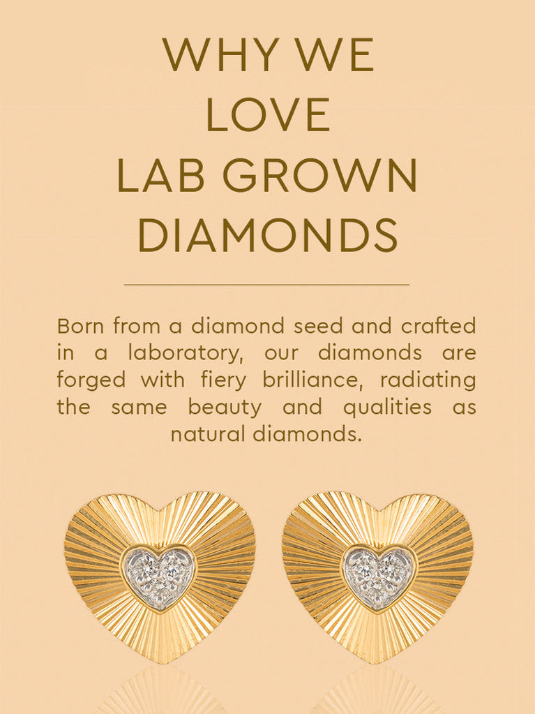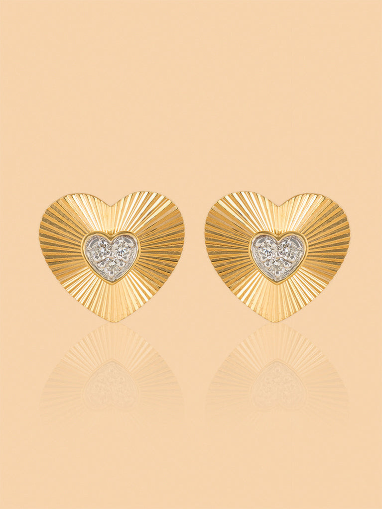Romance meets refinement in these exquisite heart-shaped studs, crafted from radiant gold vermeil by Westside X Pome. Delicately textured with striped detailing, they create a shimmering halo effect that catches the light beautifully. At the center, a brilliant lab-grown diamond adds just the right touch of sparkle. Perfect for date nights, celebrations, or whenever you want to wear a little love.