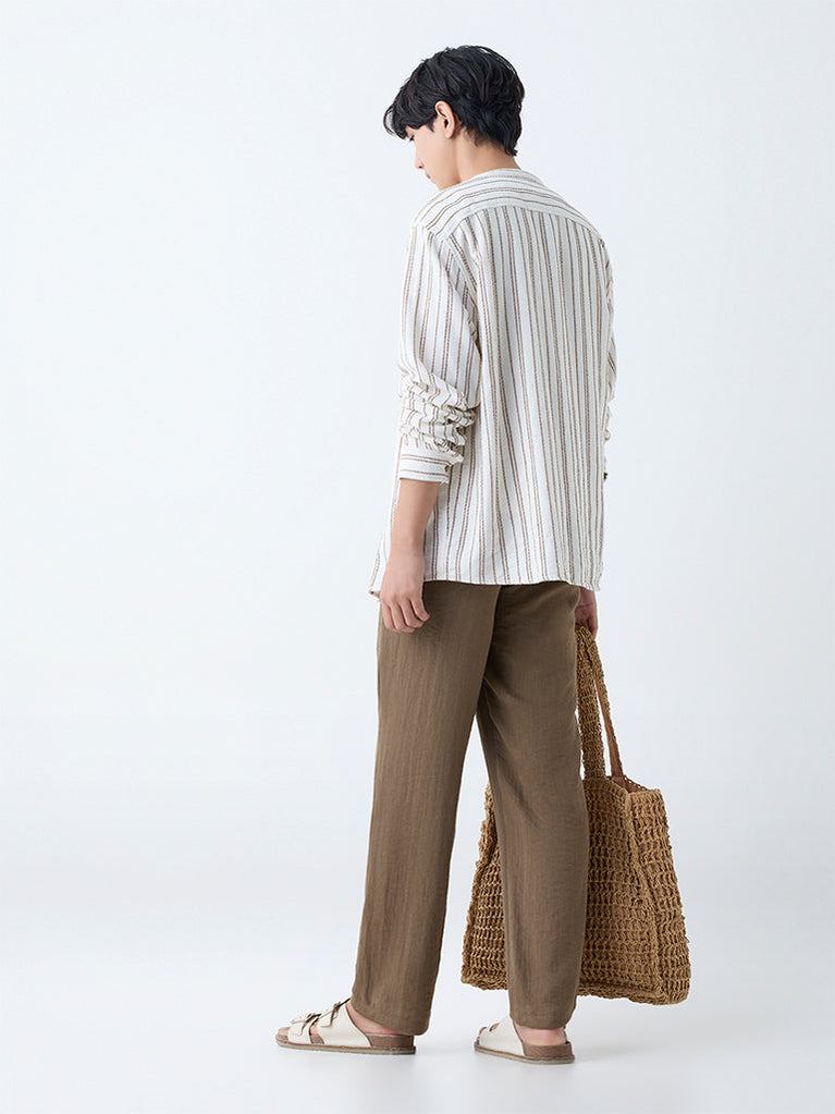 Bring earthy tones to your wardrobe with this dark beige shirt from ETA. Made from pure cotton in a relaxed fit, it features subtle stripe detailing, a band collar, full sleeves, and a button-down front — ideal for effortless everyday style with a refined edge.
