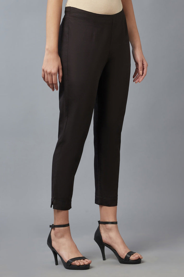 Black solid trousers with elasticated back. Wear these with contrast color kurta and ring-toed flats.