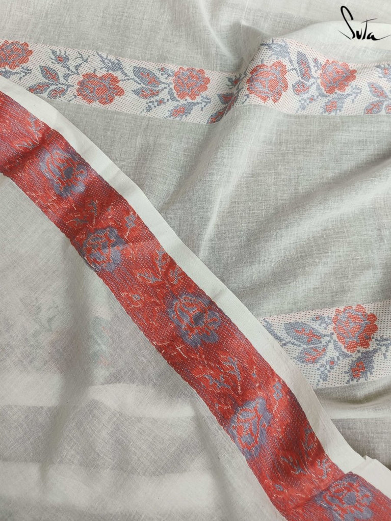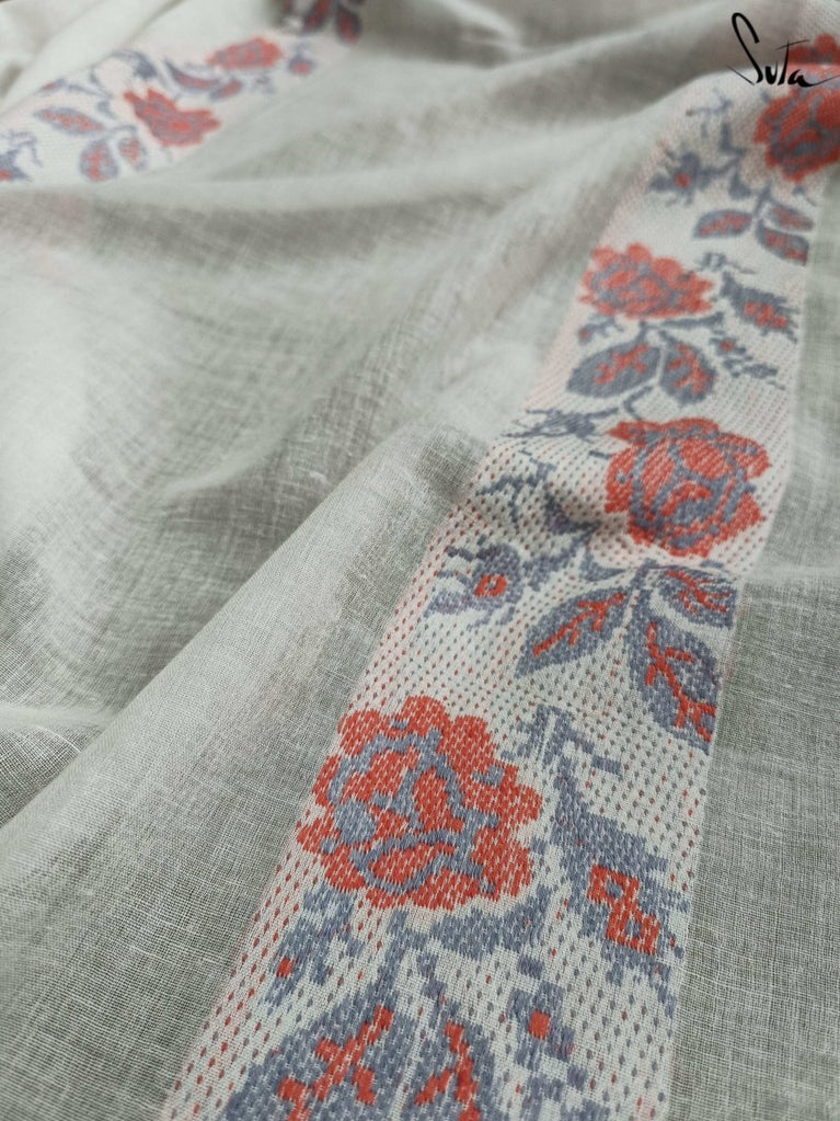 Arali is crafted from a cotton viscose blend, embodying the essence of a flower garden. This off-white saree drapes beautifully and a classic gold zari border adds a touch of regal opulence.