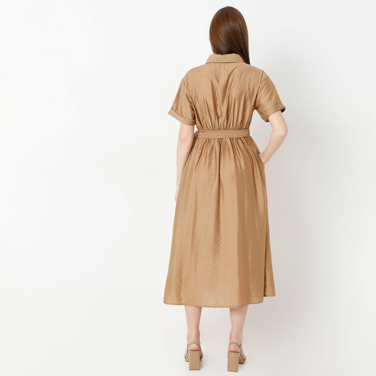 Below Knee Sleeveless Shirt Collar Schiffli Flare Fit Dress