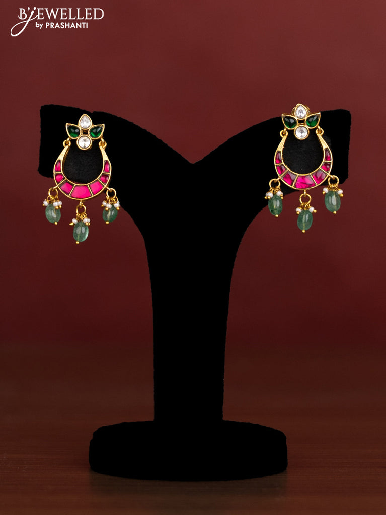 Antique beaded green haaram with side pendant and pink kemp stone