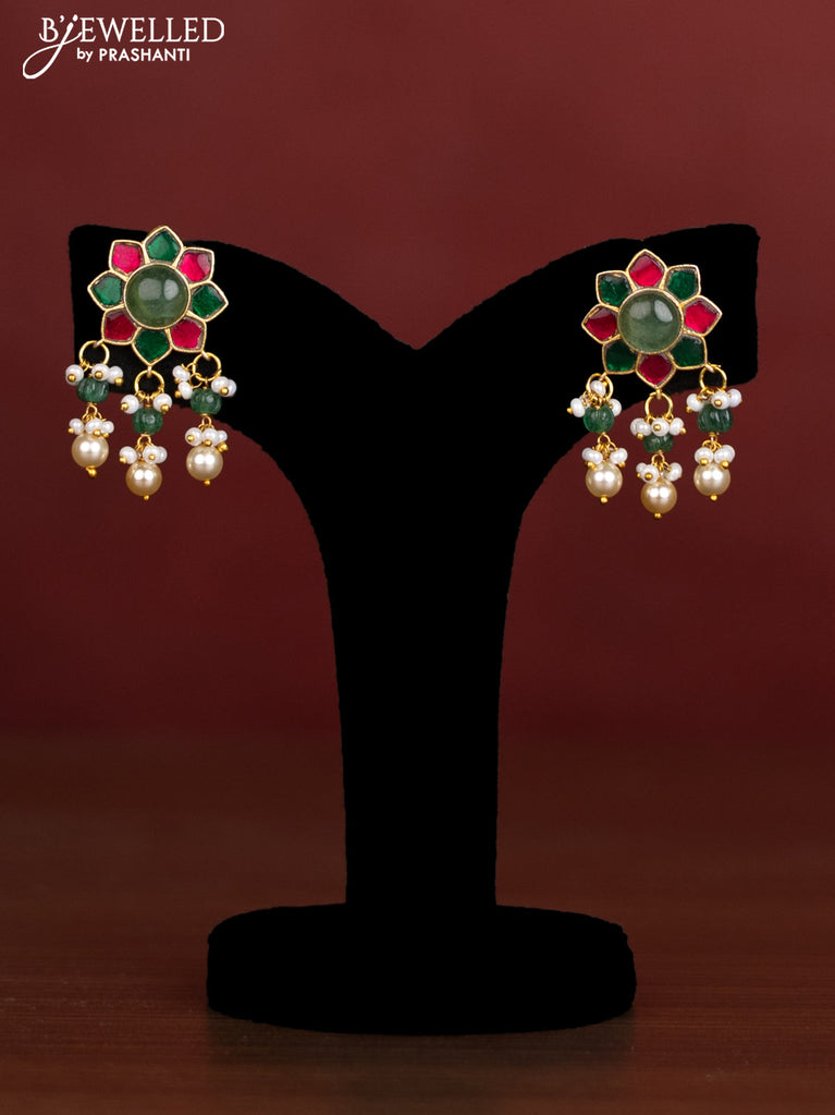 Antique beaded green and pearl necklace with a floral pendant, jadau kundan stones, and pearl & bead hangings