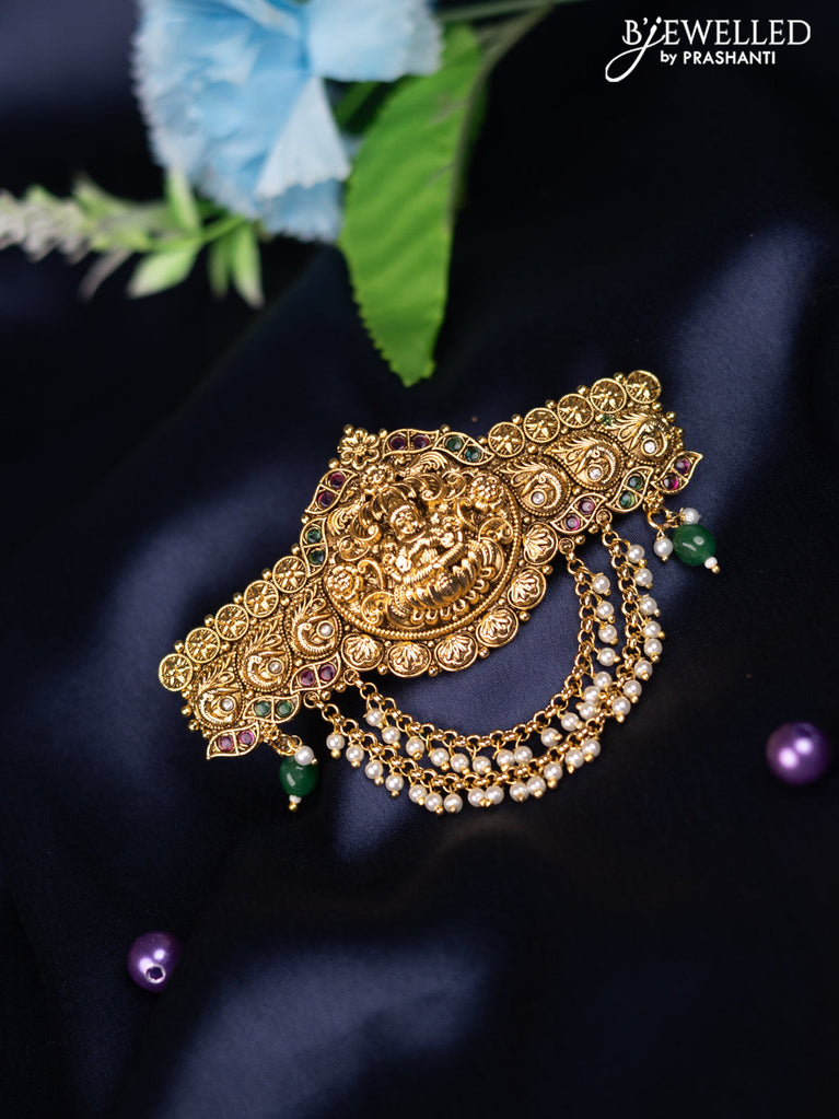 Antique hair clip big size lakshmi design with kemp stones and pearl hangings
